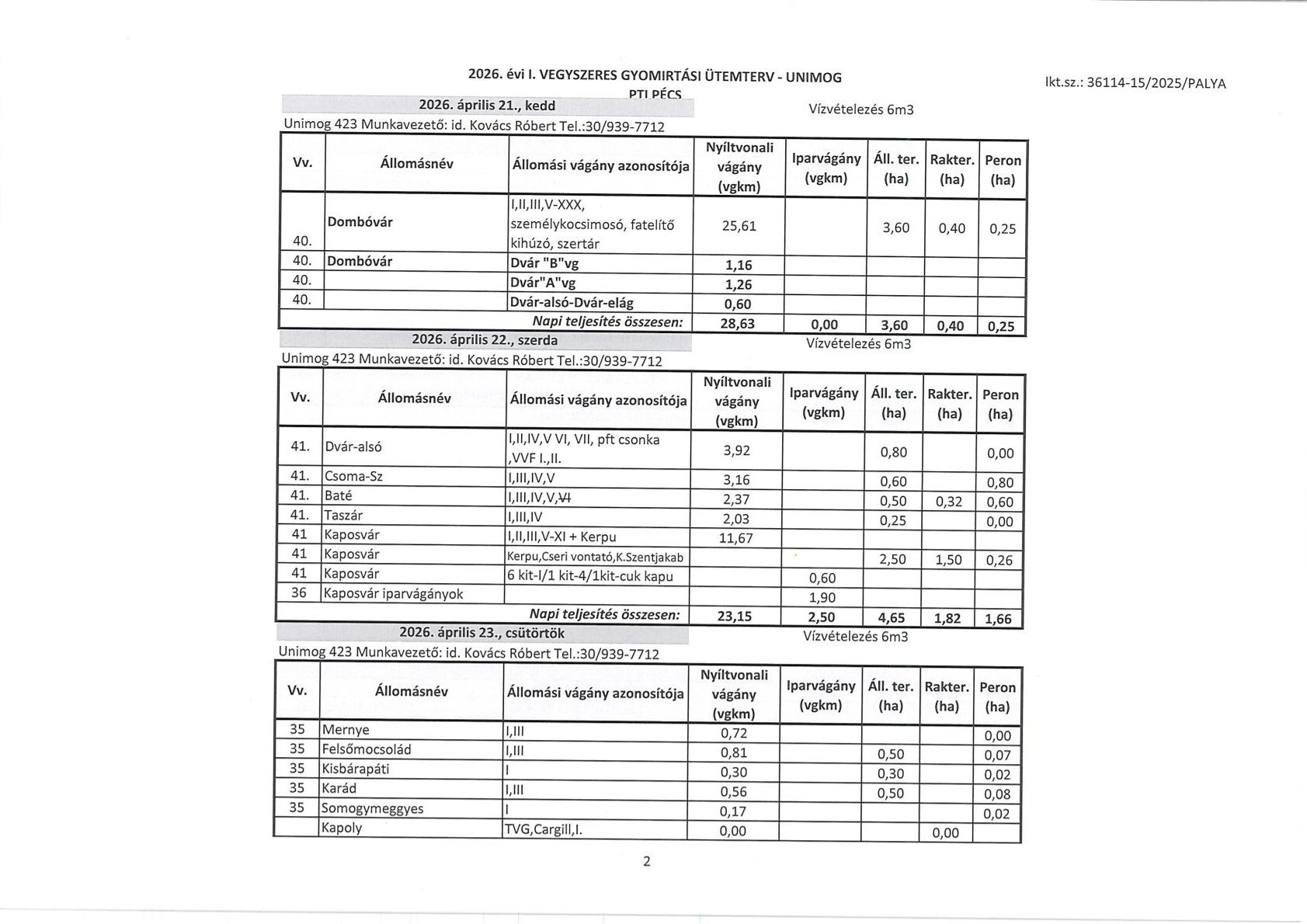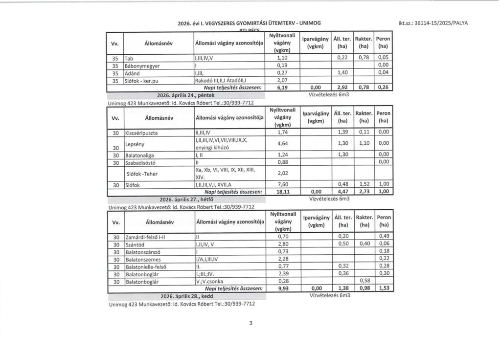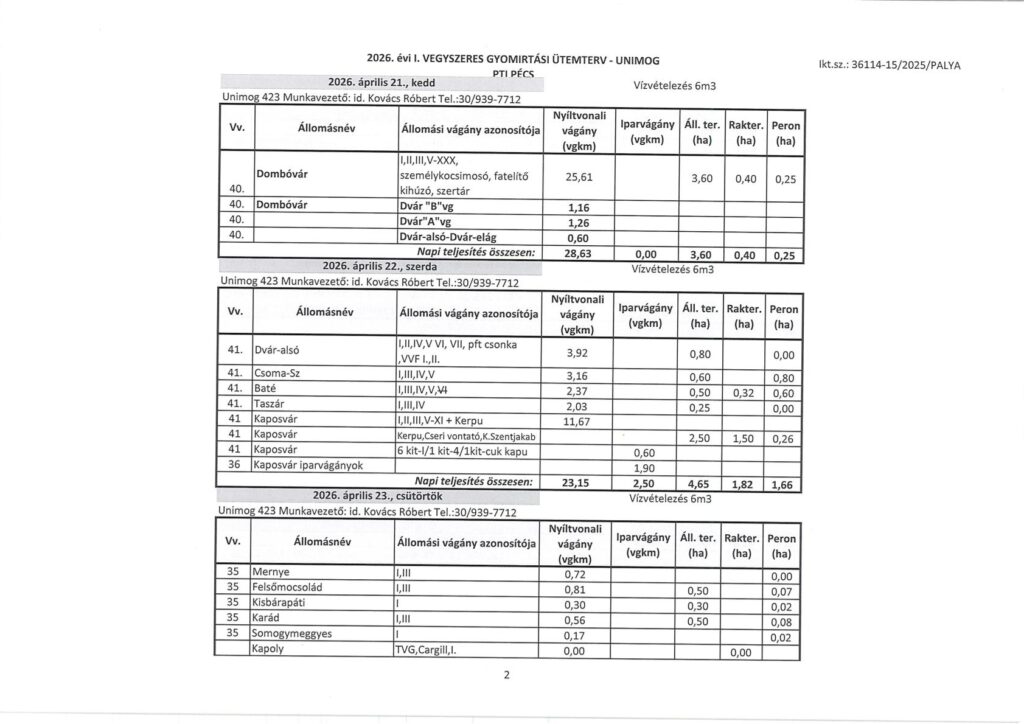 Tájékoztatjuk Önöket, hogy a MÁV ZRT megkezdi Pécs Területi Igazgatóság működési területén az állomások illetve egyes vonalak vegyszeres gyomirtását a lenti táblázat szerint.