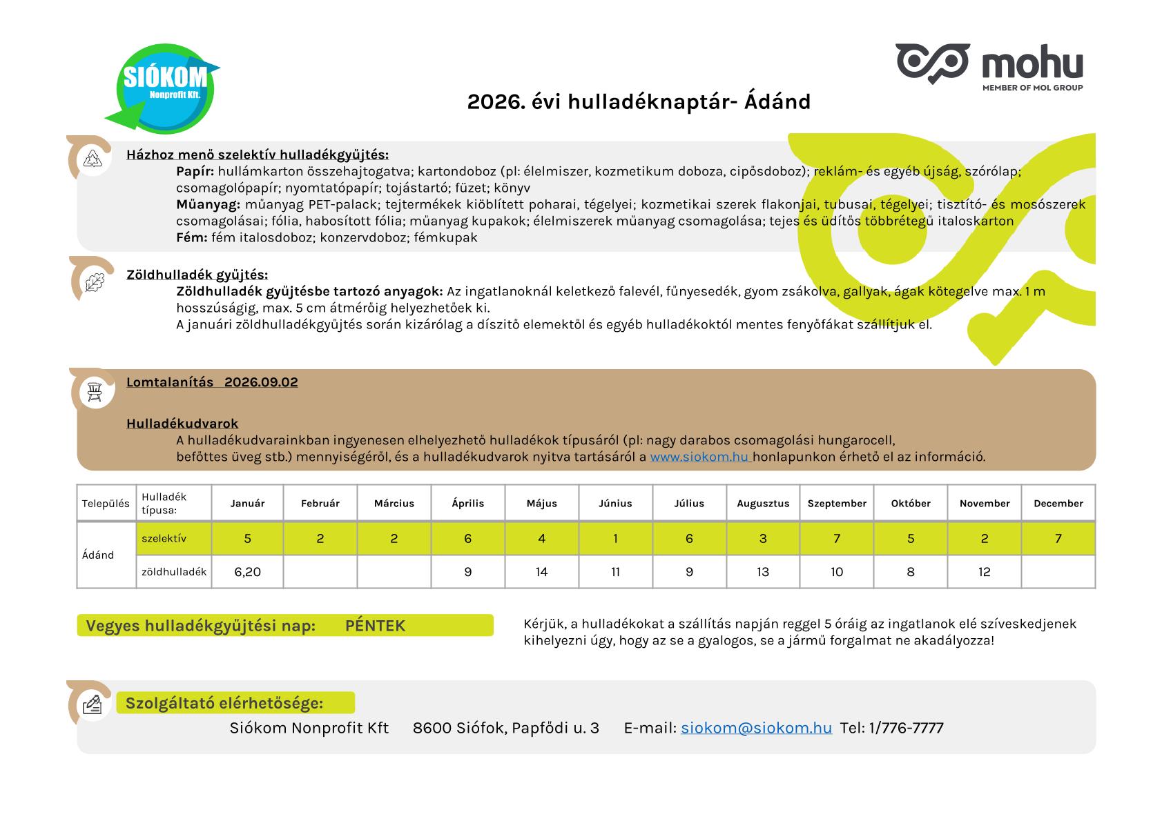 Hulladékszállítási naptár 2026. évi